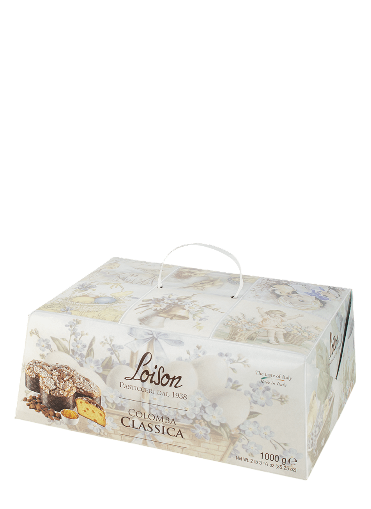 The classic Easter Colomba is a soft cake made through natural fermentation with sourdough starter. It has an irregular oval shape, reminiscent of a dove-shaped cake. The classic Easter Colomba has a soft, well-aired dough, enriched with candied Sicilian orange peel. The surface is covered with Italian almond glaze and granulated sugar.