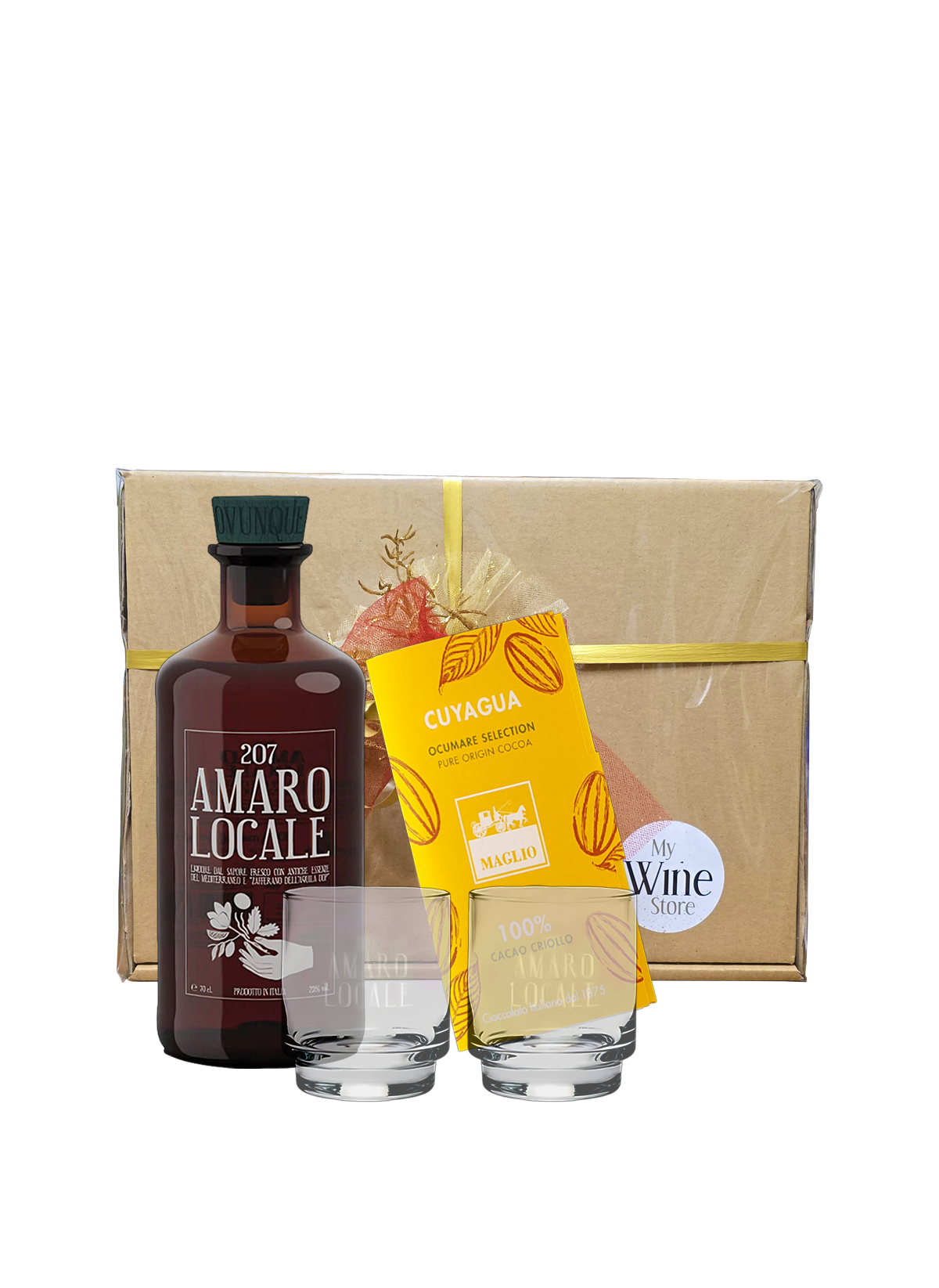 Tasting box containing a fine bottle of Amaro Locale, distilled according to ancient recipes, is accompanied by a refined tasting glass specially designed to enhance its aromatic notes. To complete the experience, an exquisite package of Maglio Nano Mandarin Fillets, candied and covered in dark chocolate, for a perfect combination of sweetness and bitterness.