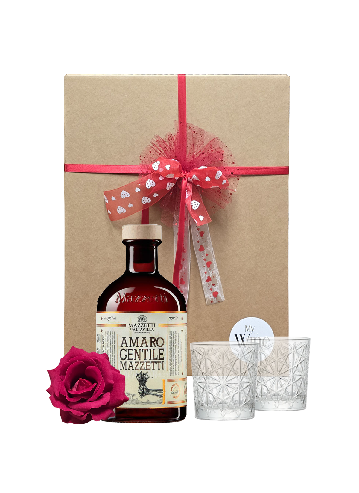 Surprise your loved one with a unique gift to share. A special box containing Gentile Mazzetti amaro and two tasting glasses, packed with themed accessories and decorations to celebrate your love!