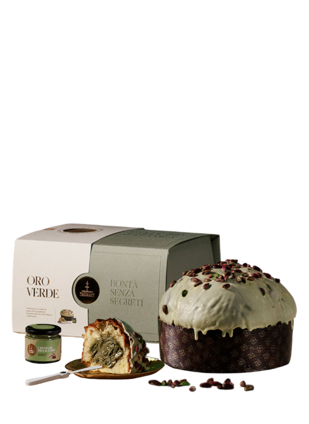 Ingredients: Panettone: Soft wheat flour, butter, sugar, fresh eggs, fresh egg yolk, natural yeast (contains wheat flour), Sicilian honey, inverted sugar, orange purée (ground orange peel, sugar, lemon juice concentrate), emulsifier: mono-and diglycerides of fatty acids, cocoa butter, powdered skimmed milk, salt, natural flavourings: vanilla berries. Covering white chocolate (9%) (sugar, cocoa butter, whole powdered milk, emulsifier: soy lecithin, natural vanilla extract), pistachio (Pistacia vera) (3%). May contain traces of other nuts. Cream: Sugar, pistachio (Pistacia vera) (22%), vegetable oils and fats (sunflower oil, cocoa butter, safflower), powdered skimmed milk, whey powder, emulsifier: soy lecithin, natural flavourings, colouring agent (curcumin, chlorophyll cupric), salt. May contain traces of other nuts and lupin flour.