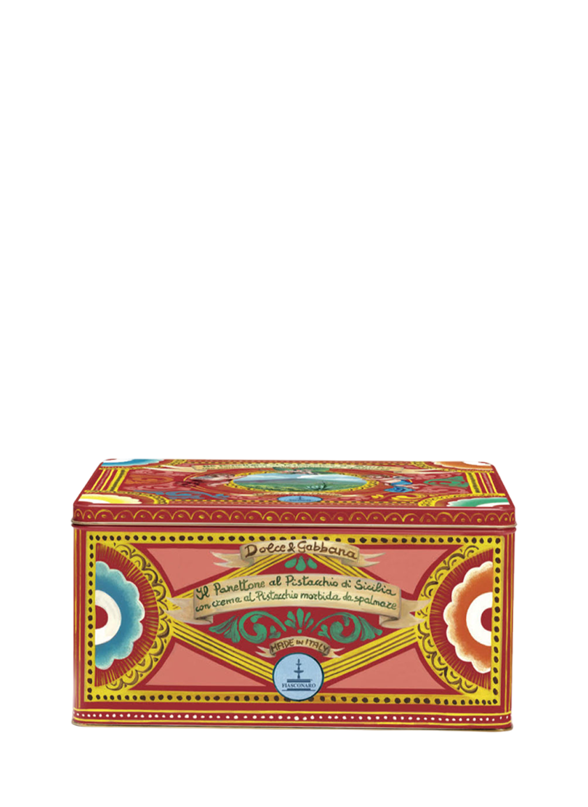 The Fiasconaro Dolce & Gabbana pistachio panettone is an exclusive reinterpretation of the typical Milanese dessert in a Sicilian key that comes from the union between D&G creative flair and Fiasconaro confectionery art. It is paired with pistachio spread, inside an original tin box decorated with the D&G signature.