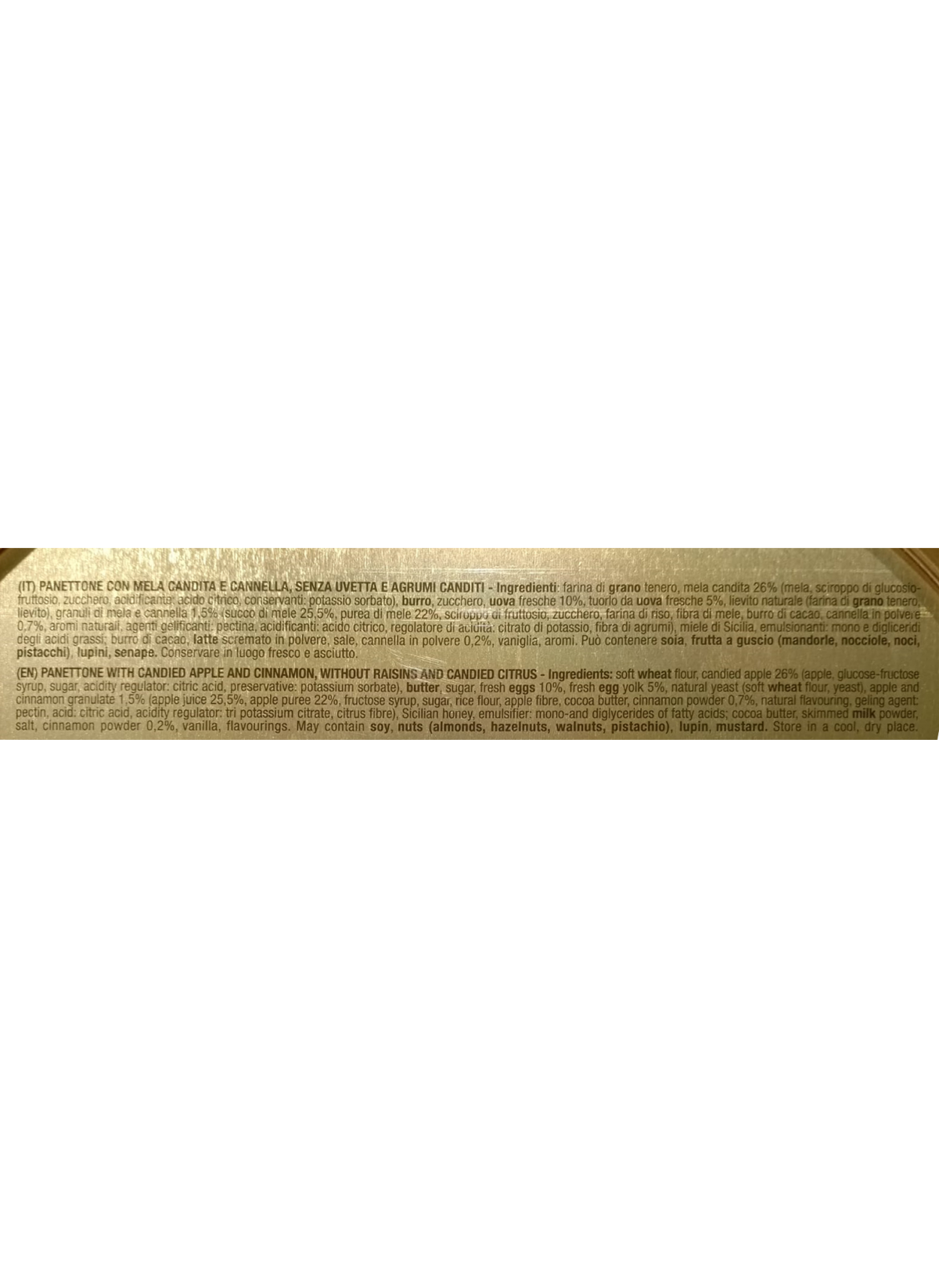 Ingredients: soft wheat flour, candied apple 27% (apple, glucose-fructose syrup, sucrose, acidifier: citric acid, preservatives: potassium sorbate), butter, sugar, fresh free-range eggs 10%, egg yolk fresh from free-range hens 5.4%, natural yeast (soft wheat flour), apple and cinnamon granules 1.6% (apple juice 25.5%, apple puree 22%, fructose syrup, sugar, rice flour, apple fibre, cocoa butter, cinnamon powder, natural flavourings, gelling agents: pectin, acidifiers: citric acid, acidity regulator: potassium citrate, citrus fibre), Sicilian honey, invert sugar syrup , emulsifiers: mono and diglycerides of fatty acids; cocoa butter, skimmed milk powder, salt, cinnamon powder 0.2%, natural flavourings, vanilla. May contain soya, nuts (almonds, hazelnuts, walnuts, pistachios), lupins, mustard.