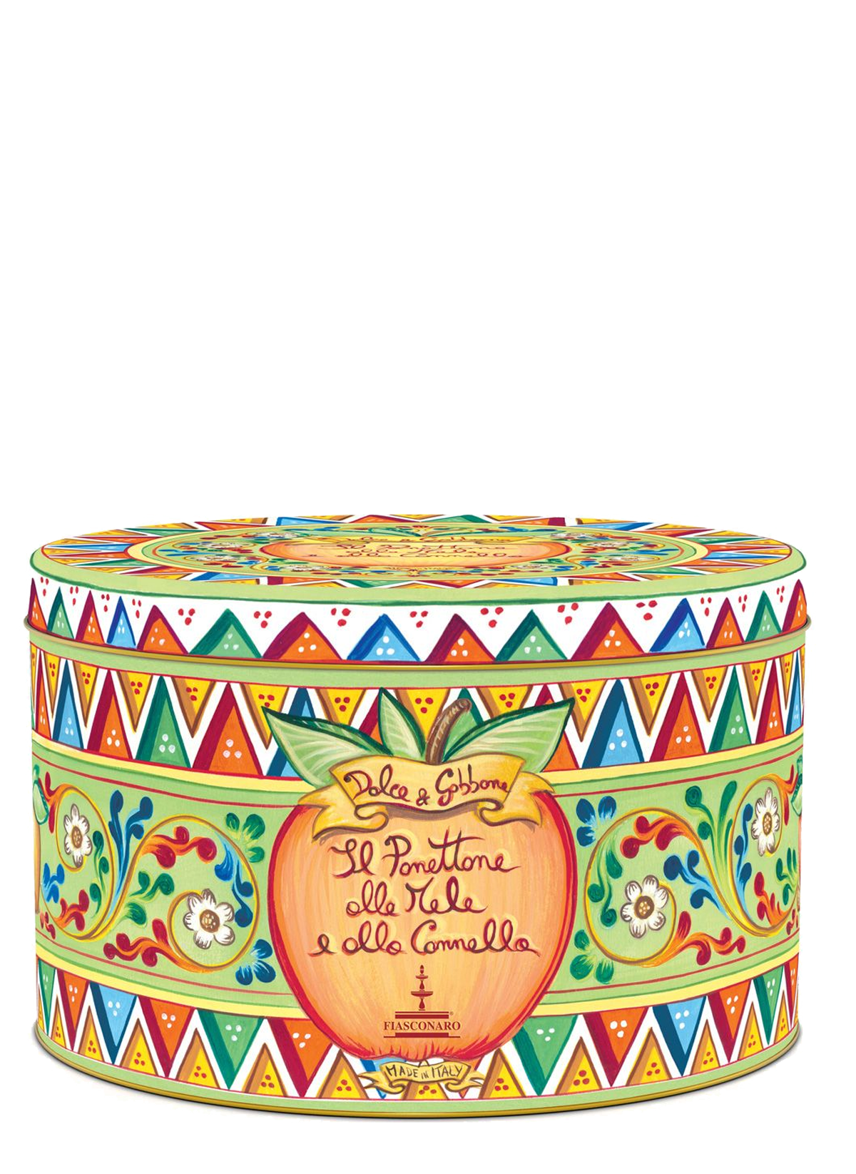 Artisanal Panettone created by Fiasconaro in collaboration with Dolce&Gabbana with Apples and Cinnamon. Without raisins and without candied citrus fruits, just the classic, very soft Fiasconaro dough seasoned with candied apples and cinnamon. Packaged in a beautiful D&G signed tin box.