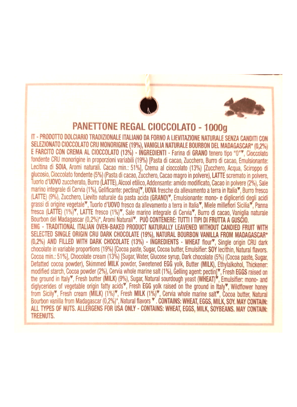 The Loison Regal Chocolate Panettone has a soft and well-soluble paste, yellow in color and well honeycombed and enriched with dark chocolate chips and Madacascar vanilla and dark chocolate cream. Dough from sourdough leavened for 72 hours with excellent digestibility. A delicious panettone produced with high quality raw materials.