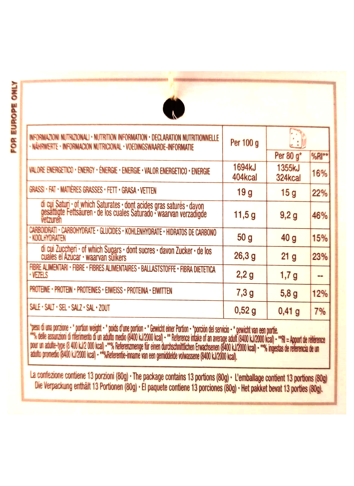 Ingredients: Type "0" soft WHEAT flour, Dark chocolate chips (18%) [Cocoa paste, Sugar, Cocoa butter, Emulsifier: SOY lecithin, Natural flavourings. Min. cocoa: 51%], Chocolate cream (15%) [Sugar, Glucose syrup, Water, Dark chocolate (5%) (Cocoa paste,