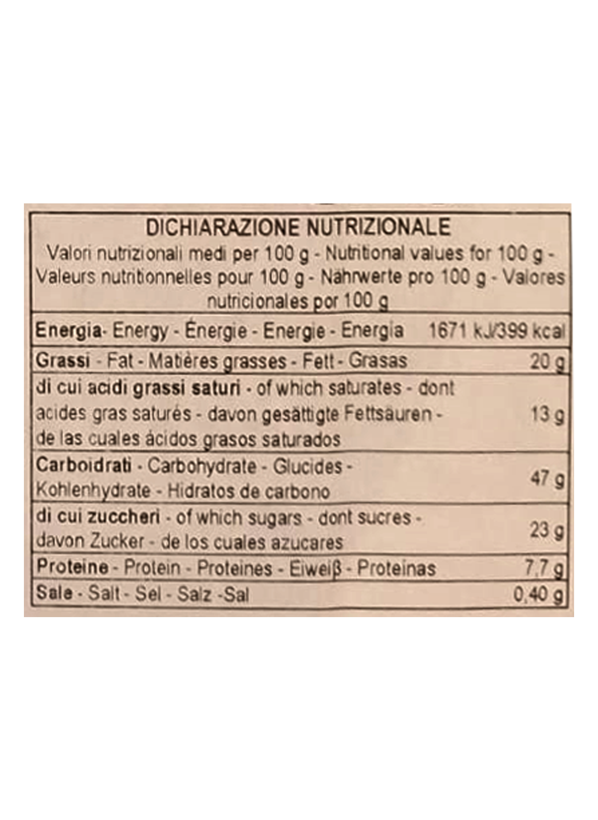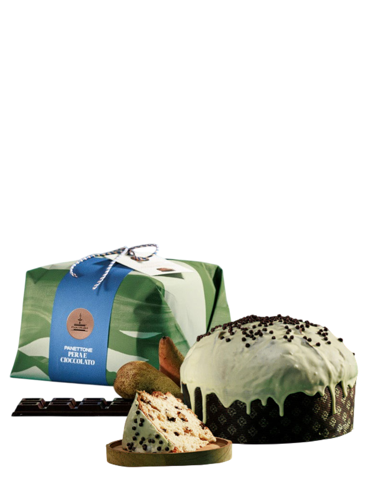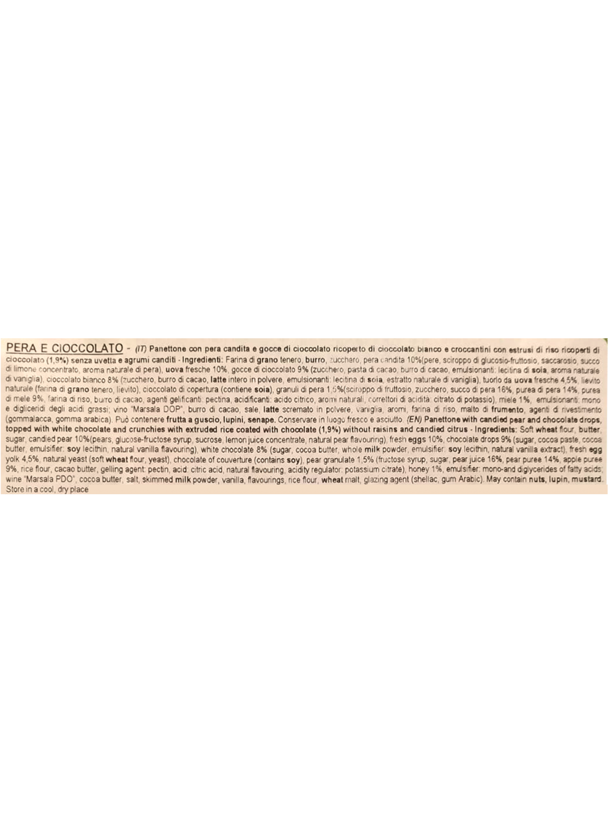 Ingredients: Soft wheat flour, butter, sugar, fresh eggs, candied pear (9%) (pear, glucose-fructose syrup, sucrose, lemon juice concentrate), chocolate drops (8%) (sugar, cocoa paste, cocoa butter, emulsifier: soy lecithin, vanilla extract), fresh egg yolk, natural yeast (contains wheat flour), Sicilian honey, inverted sugar, emulsifier: mono-and diglycerides of fatty acids, Marsala, cocoa butter, powdered skimmed milk, salt, natural flavourings: vanilla berries. Covering white chocolate (9%) (sugar, cocoa butter, whole powdered milk, emulsifier: soy lecithin, natural vanilla extract), chocolate crunchies (contains: soy, wheat) (2%). May contain traces of nuts.