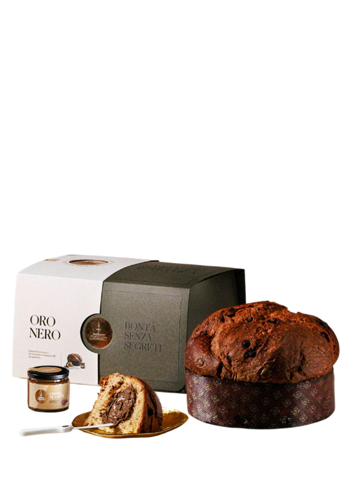 Ingredients: Panettone: Soft wheat flour, butter, sugar, fresh eggs, chocolate drops (10%) (sugar, cocoa paste, cocoa butter, emulsifier: soy lecithin, vanilla extract), fresh eggs yolk, natural yeast (contains wheat flour), hazelnut paste (2%), Sicilian honey, inverted sugar, orange purée (ground orange peel, sugar, lemon juice concentrate), emulsifier: mono-and diglycerides of fatty acids, cocoa butter, powdered skimmed milk, salt, coffee flavourings, natural flavourings: vanilla berries. May contain traces of other nuts. Cream: Sugar, vegetable oils and fats (sunflower oil, cocoa butter, safflower), powdered skimmed milk, whey powder, coffee bean (4,1%), hazelnuts (Corylus avellana), instant coffee (2,1%), whey protein, emulsifier: soy lecithin, natural flavourings. May contain traces of other nuts and lupin flour.
