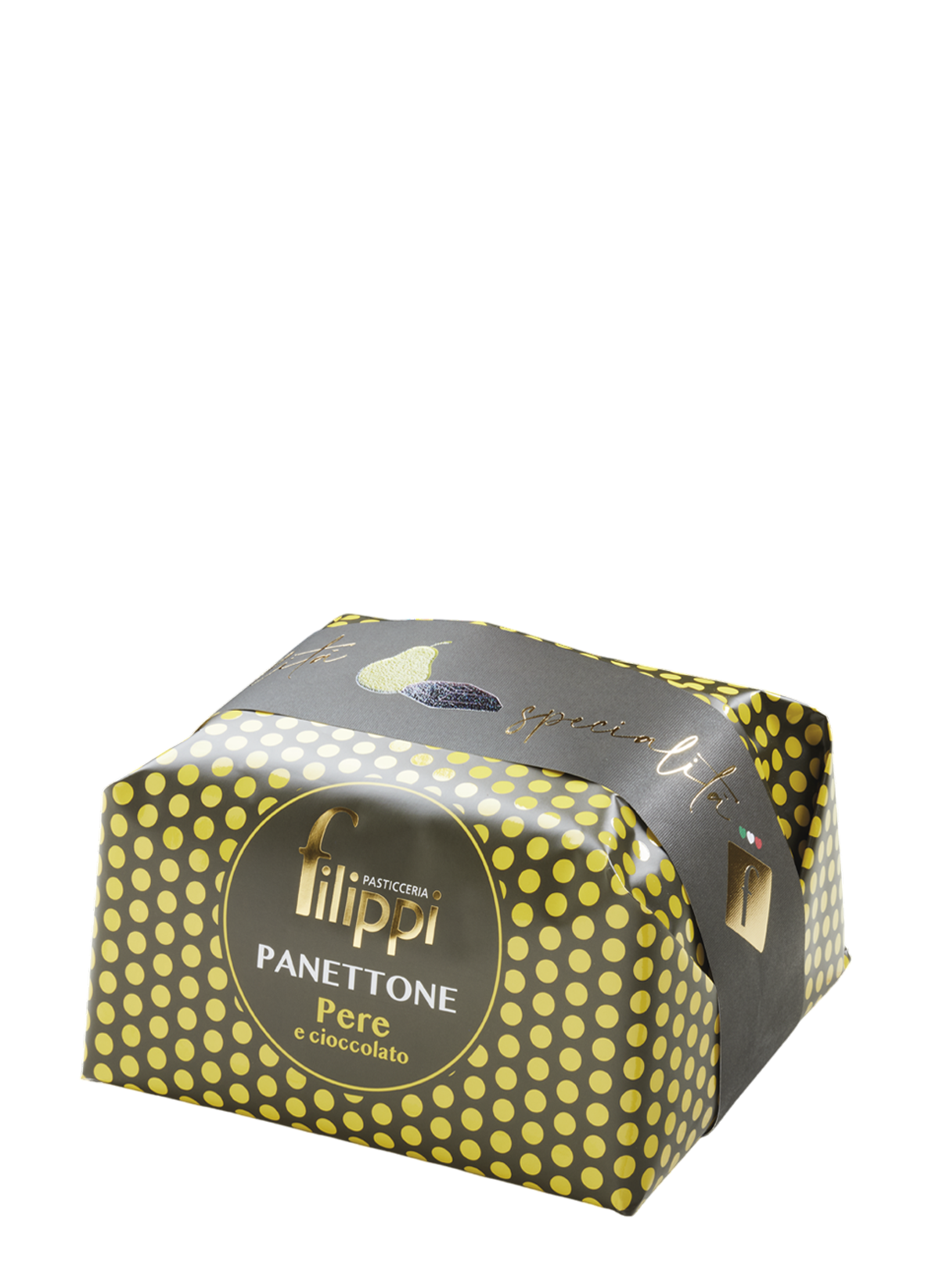 Discover the Filippi Pear and Chocolate Panettone, an irresistible combination of the natural sweetness of candied pears and the intensity of the finest chocolate. A soft, fragrant, and authentic leavened cake, designed to win you over at first bite. An elegance of flavors that makes every slice a special pleasure.