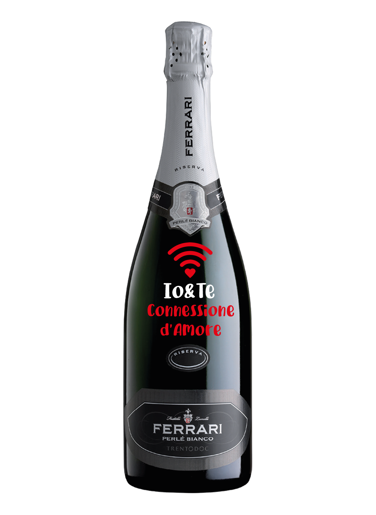 Quella che vedi in foto è un esempio di come sarà la tua bottiglia personalizzata. Per avere una bottiglia personalizzata devi scegliere un vino, spumante o champagne in catalogo a cui andremo ad applicare questa decorazione, impressa sul vetro.