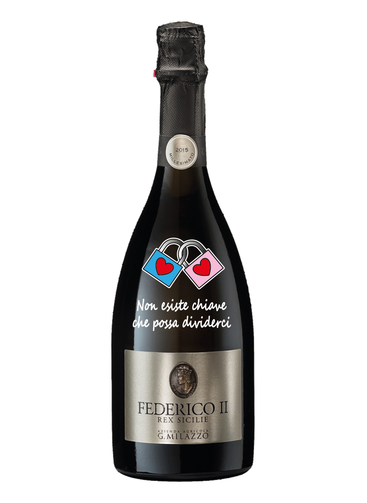 Quella che vedi in foto è un esempio di come sarà la tua bottiglia personalizzata. Per avere una bottiglia personalizzata devi scegliere un vino, spumante o champagne in catalogo a cui andremo ad applicare questa decorazione, impressa sul vetro.