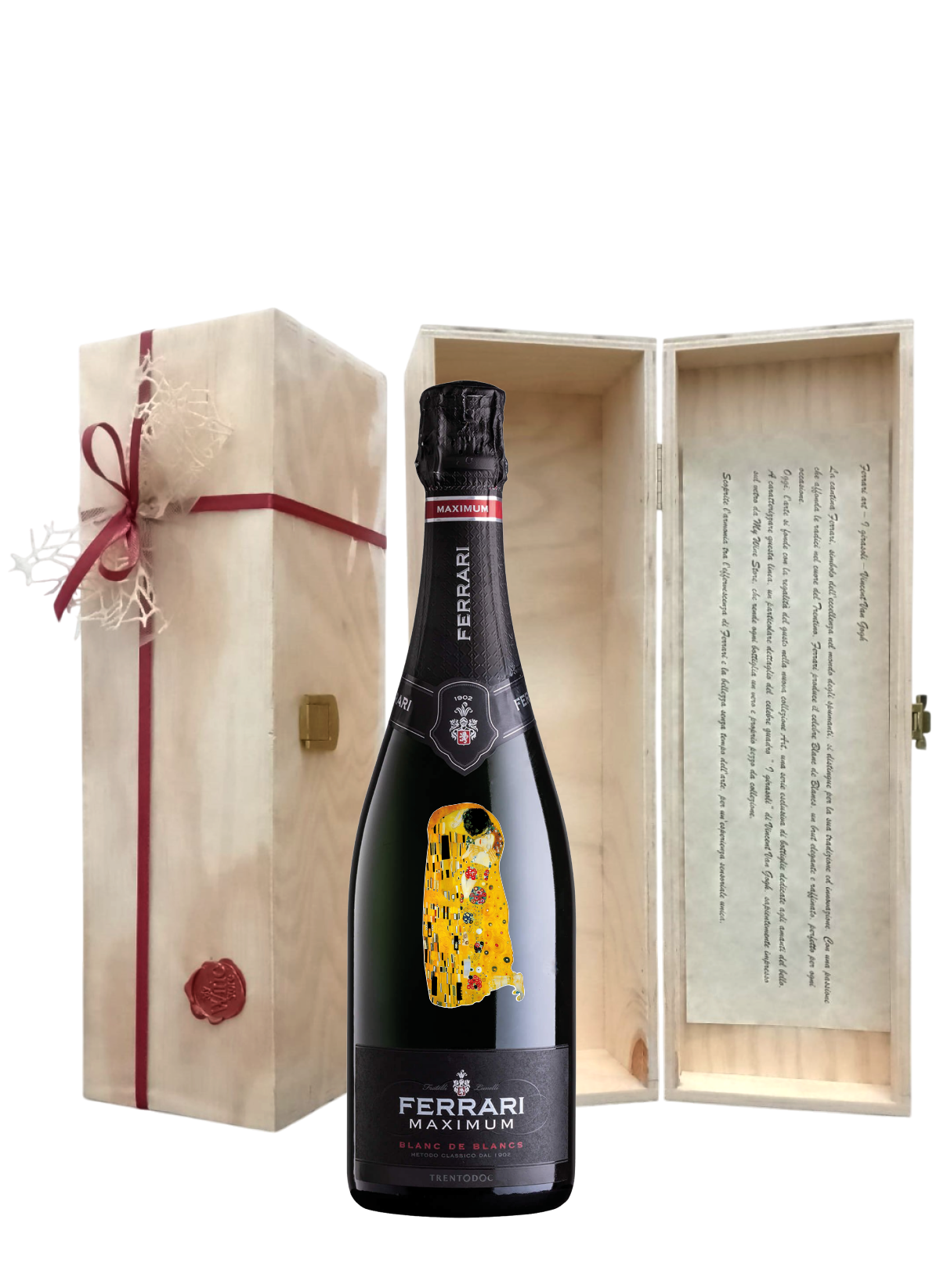 Il Ferrari Maximum Blanc de Blancs in una speciale edizione. Regala un capolavoro, trasforma un gesto d’affetto in un’opera d’arte, la bottiglia di questo Ferrari impreziosita da dettagli tratti da celebri capolavori, uniscono la sua eleganza alla bellezza senza tempo dell’arte. Un dono raffinato, unico e indimenticabile, perfetto per celebrare momenti speciali con stile.