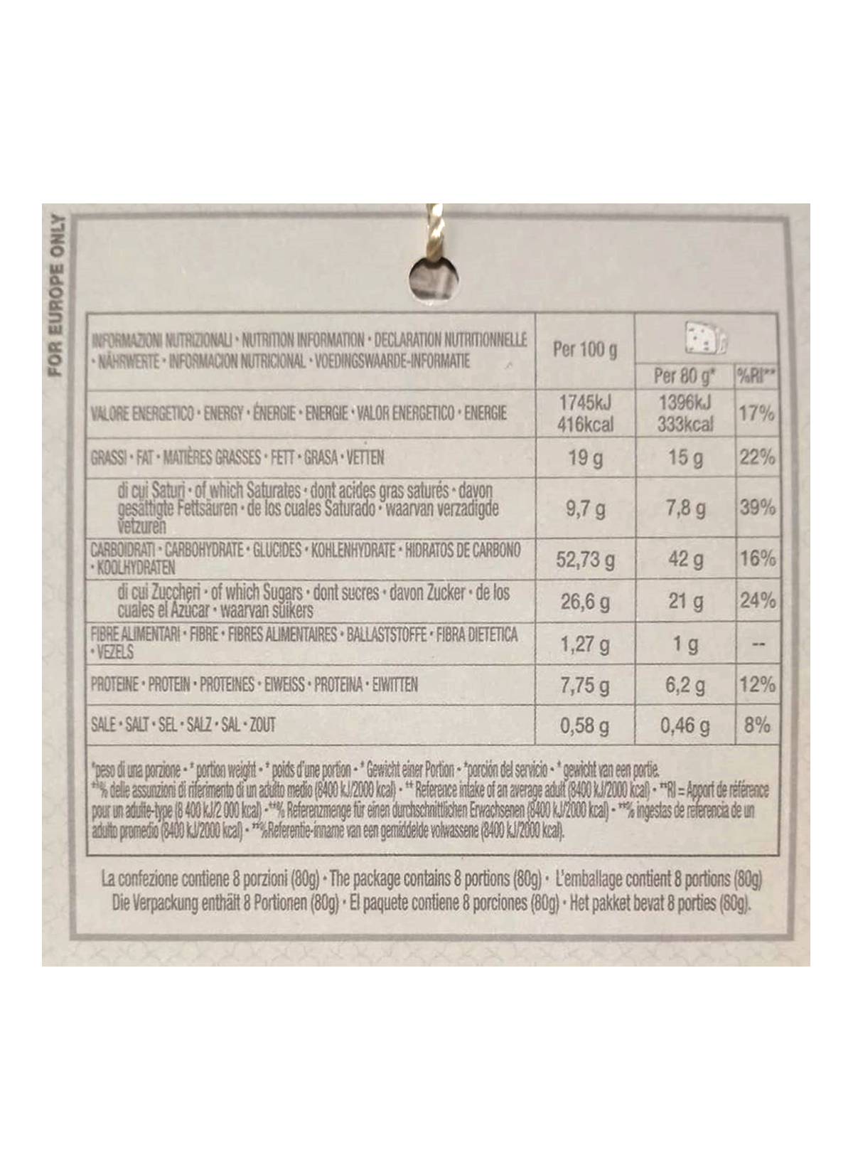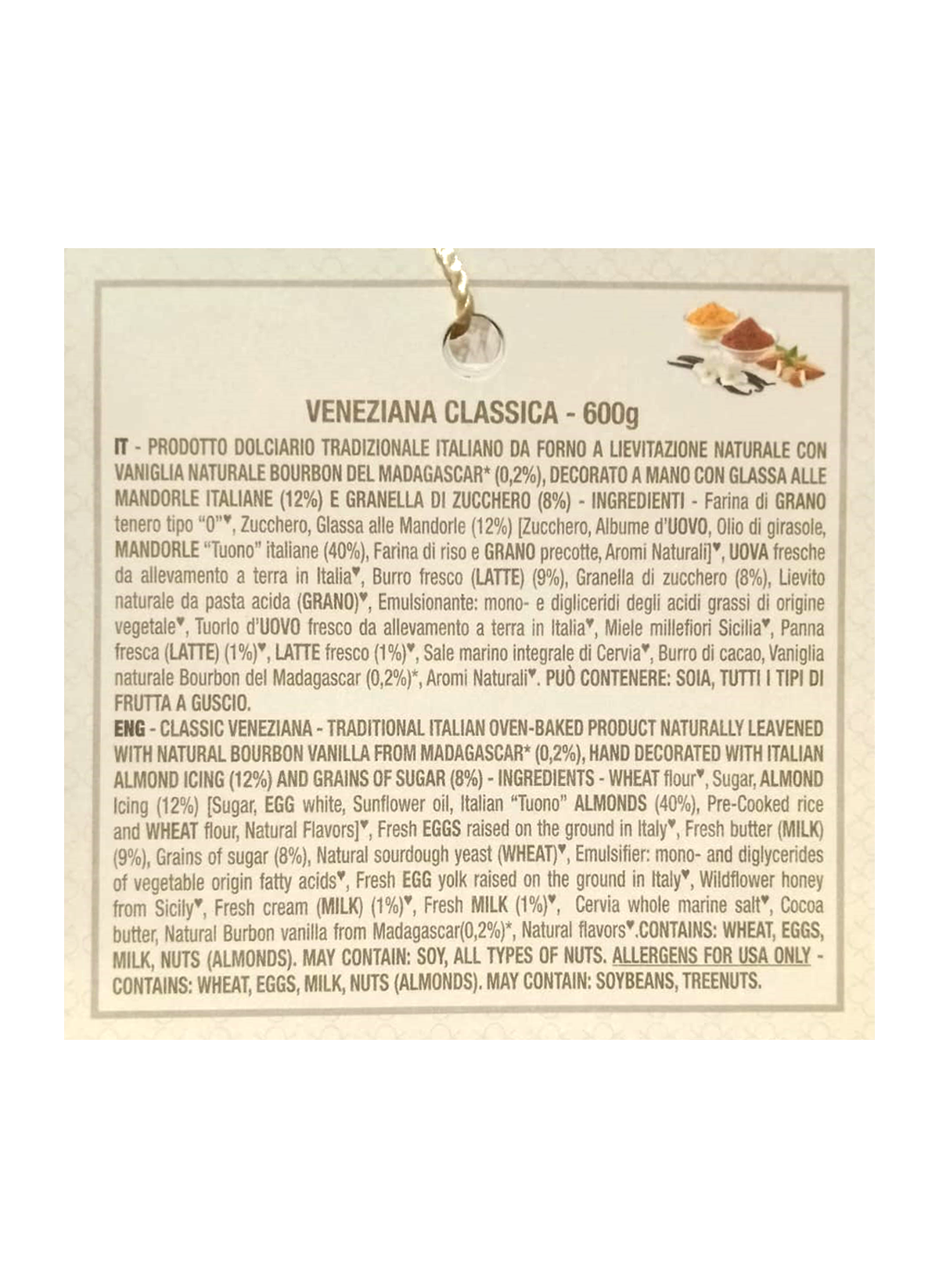 Ingredienti: Farina di grano tenero tipo “00”, Burro fresco (18%) (latte), Uova fesche, Zucchero, Glassa (8%) (Zucchero, Albume d’uovo fresco, Olio di girasole, Farina di mandorle, Amido di frumento, Aromi naturali), Lievito naturale da pasta acida (glutine), Granella di zucchero (3%), Mandorle italiane (3%), Emulsionante: mono- e digliceridi degli acidi grassi di origine vegetale, Miele italiano, Panna Fresca (2%) (latte), Latte fresco di alta qualità (0,5%), Burro di cacao, Sale marino integrale di Cervia, Vaniglia Naturale Mananara del Madagascar* (0,2%), Aromi naturali, Spezie.