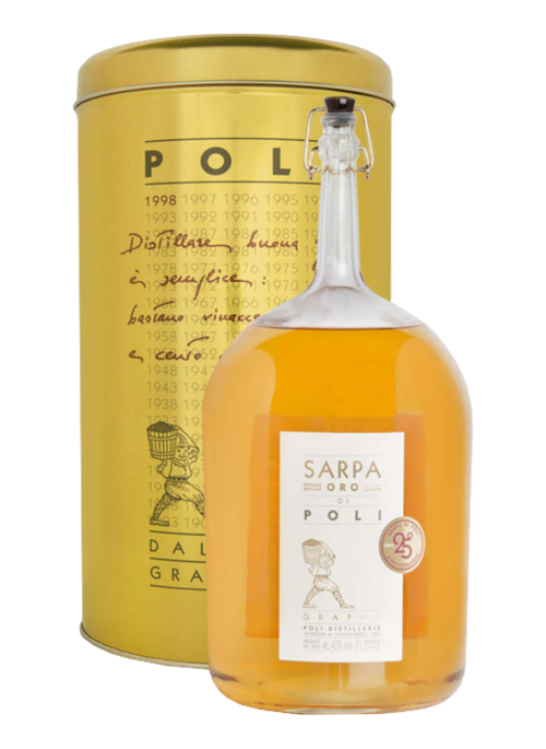 La Grappa Sarpa Oro di Poli è un distillato che si ottiene da vinacce di Merlot e Cabernet tramite un processo di distillazione artigianale a piccoli lotti in alambicchi di rame a ciclo discontinuo. Le botti utilizzate per l'invecchiamento sono di rovere francese da 225 litri. E' una Grappa dal forte carattere che racchiude e custodisce tutta la passione della famiglia Poli.