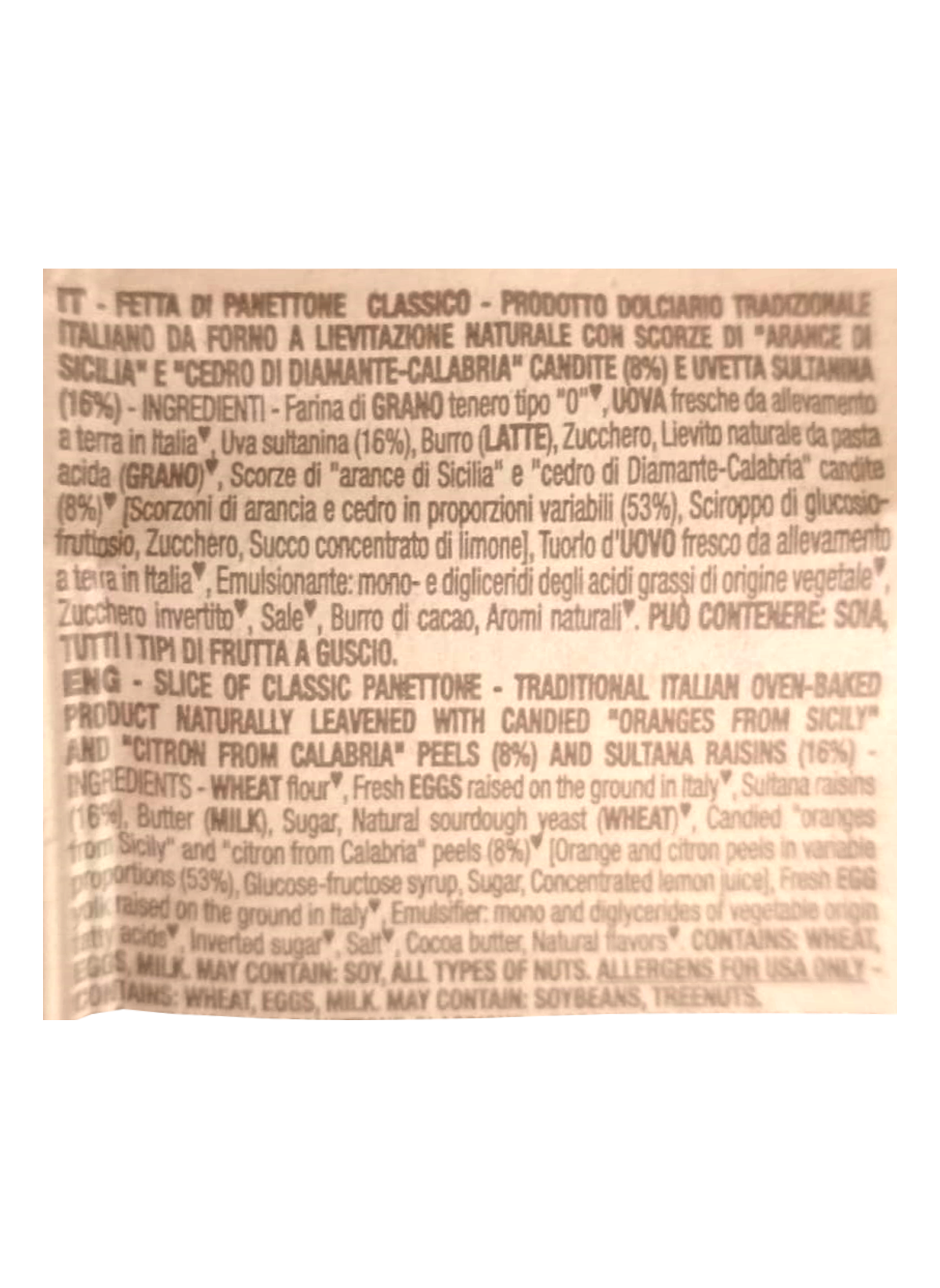 Ingredienti: Farina di grano tenero tipo "0", UOVA fresche da allevamento a terra in italia, Uva sultanina (16%), Burro (LATTE), Zucchero, Lievito naturale da pasta acida (GRANO), Scorze di "cedro di diamante-calabria" candite (4%) [Scorzoni di cedro (53%), Sciroppo di glucosio-fruttosio, Zucchero, Succo concentrato di limone], Scorze di "arance di sicilia" candite (4%) [Scorzoni di arancia (52%), Sciroppo di glucosio-fruttosio, Zucchero, Succo concentrato di limone], Tuorlo d'UOVO fresco da allevamento a terra in italia, Emulsionante: mono- e digliceridi degli acidi grassi di origine vegetale, Zucchero invertito, Sale, Burro di cacao, Aromi naturali.