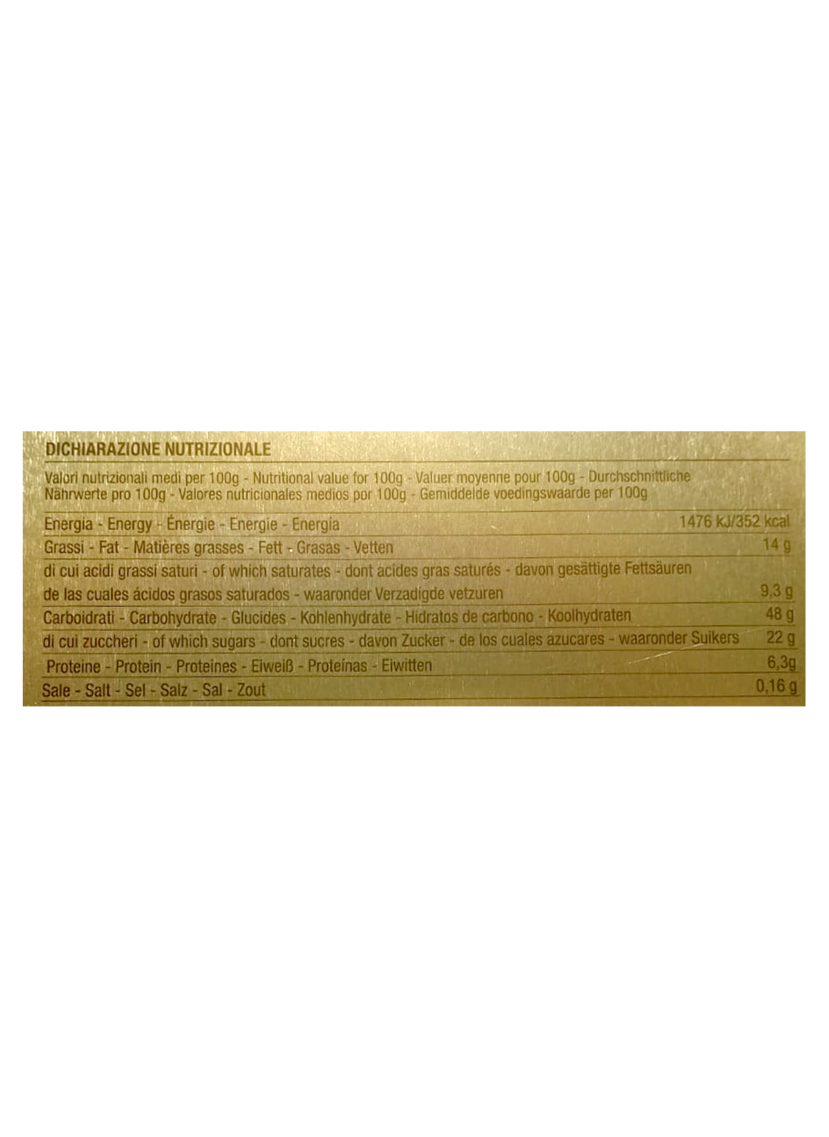Ingredienti: farina di grano tenero, mela candita 27% (mela, sciroppo di glucosio-fruttosio, saccarosio, acidificante: acido citrico, conservanti: potassio sorbato), burro, zucchero, uova fresche di galline allevate a terra 10%, tuorlo da uova fresche di galline allevate a terra 5,4%, lievito naturale (farina di grano tenero), granuli di mela e cannella 1,6% (succo di mele 25,5%, purea di mele 22%, sciroppo di fruttosio, zucchero, farina di riso, fibra di mele, burro di cacao, cannella in polvere, aromi naturali, agenti gelificanti: pectina, acidificanti: acido citrico, regolatore di acidità: citrato di potassio, fibra di agrumi), miele di Sicilia, sciroppo di zucchero invertito, emulsionanti: mono e digliceridi degli acidi grassi; burro di cacao, latte scremato in polvere, sale, cannella in polvere 0,2%, aromi naturali, vaniglia. Può contenere soia, frutta a guscio (mandorle, nocciole, noci, pistacchi), lupini, senape.