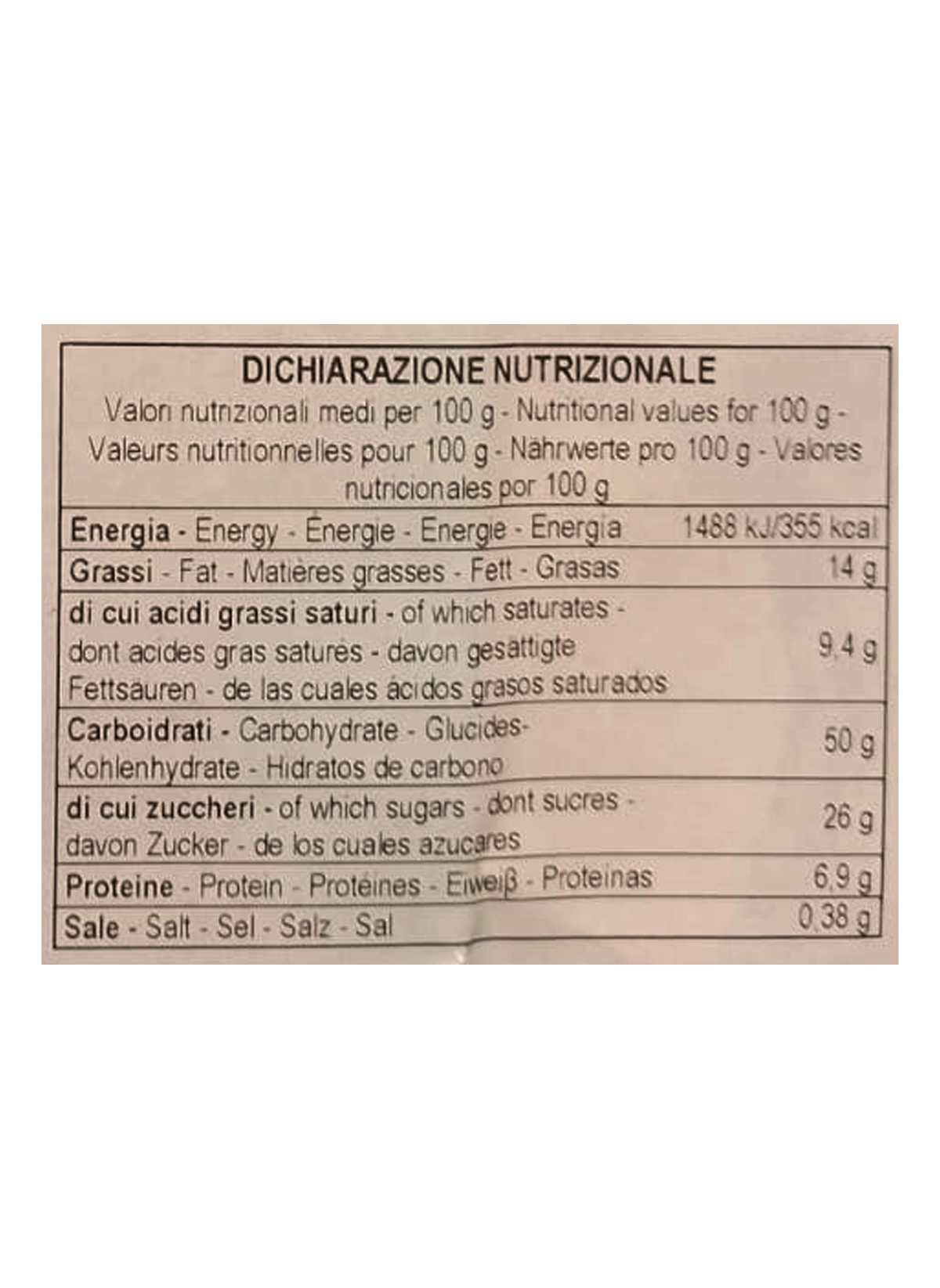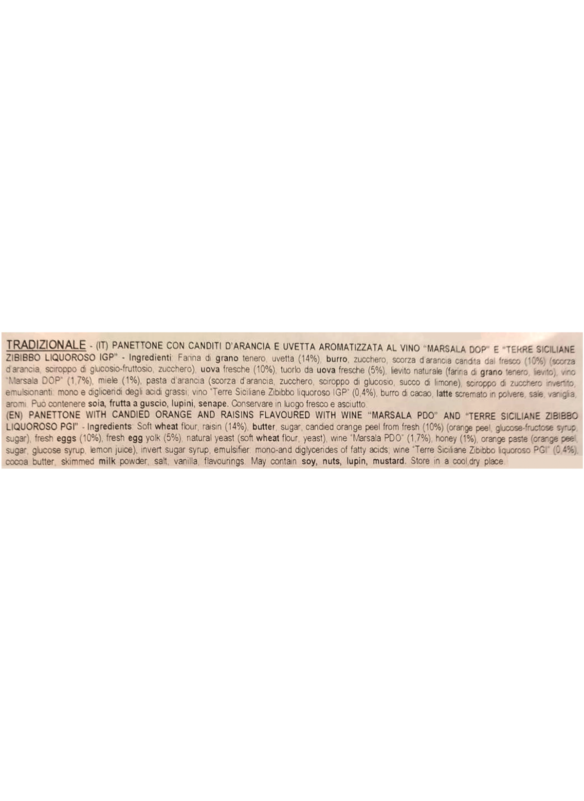 Ingredienti: Farina di grano tenero, uvetta (14%), burro, zucchero, uova fresche, scorza d’arancia candita dal fresco (10%) (scorza d’arancia, zucchero, succo di limone concentrato), tuorlo da uova fresche, lievito naturale (contiene farina di grano), Marsala (2%), miele di Sicilia, zucchero invertito, purea d’arancia, emulsionante: mono e digliceridi degli acidi grassi, vino Zibibbo (0,5%), burro di cacao, latte scremato in polvere, sale, aromi naturali: bacche di vaniglia. Può contenere tracce di frutta secca in guscio.