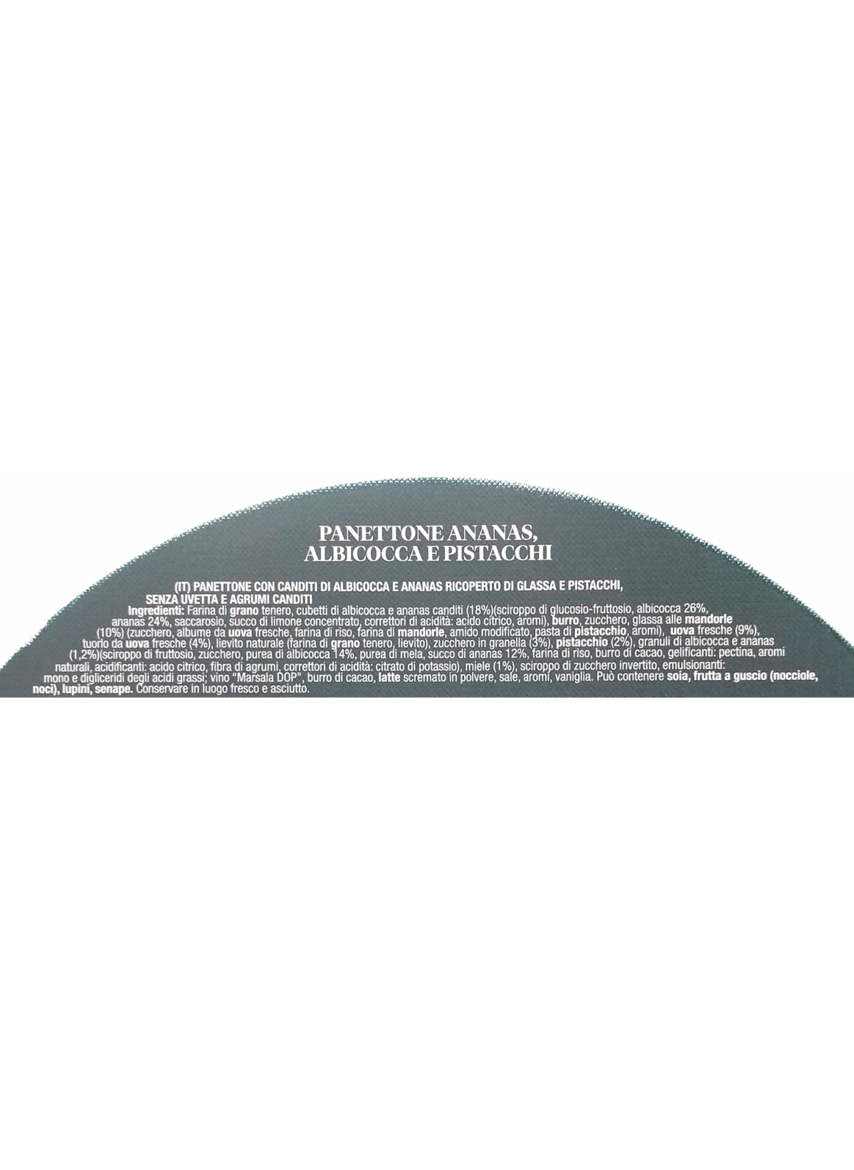Ingredienti: Farina di GRANO tenero, cubetti di albicocca e ananas canditi (18%)(sciroppo di glucosio-fruttosio, albicocca 26%, ananas 24%, saccarosio, succo di limone concentrato, correttori di acidità: acido citrico, aromi), BURRO, zucchero, glassa alle MANDORLE (10%) (zucchero, albume da UOVA fresche di galline allevate a terra, farina di riso, farina di MANDORLE, amido modificato, pasta di pistacchio, aromi), UOVA fresche di galline allevate a terra, tuorlo da UOVA fresche di galline allevate a terra, lievito naturale (farina di GRANO tenero, lievito), zucchero in granella (3%), PISTACCHIO (2%), granuli di albicocca e ananas (1,2%) (sciroppo di fruttosio, zucchero, purea di albicocca 14%, purea di mela, succo di ananas 12%, farina di riso, burro di cacao, gelificanti: pectina, aromi naturali, acidificanti: acido citrico, fibra di agrumi, correttori di acidità: citrato di potassio), miele di Sicilia, sciroppo di zucchero invertito, emulsionanti: mono e digliceridi degli acidi grassi; vino “Marsala DOP”, burro di cacao, LATTE scremato in polvere, sale, aromi, vaniglia.
