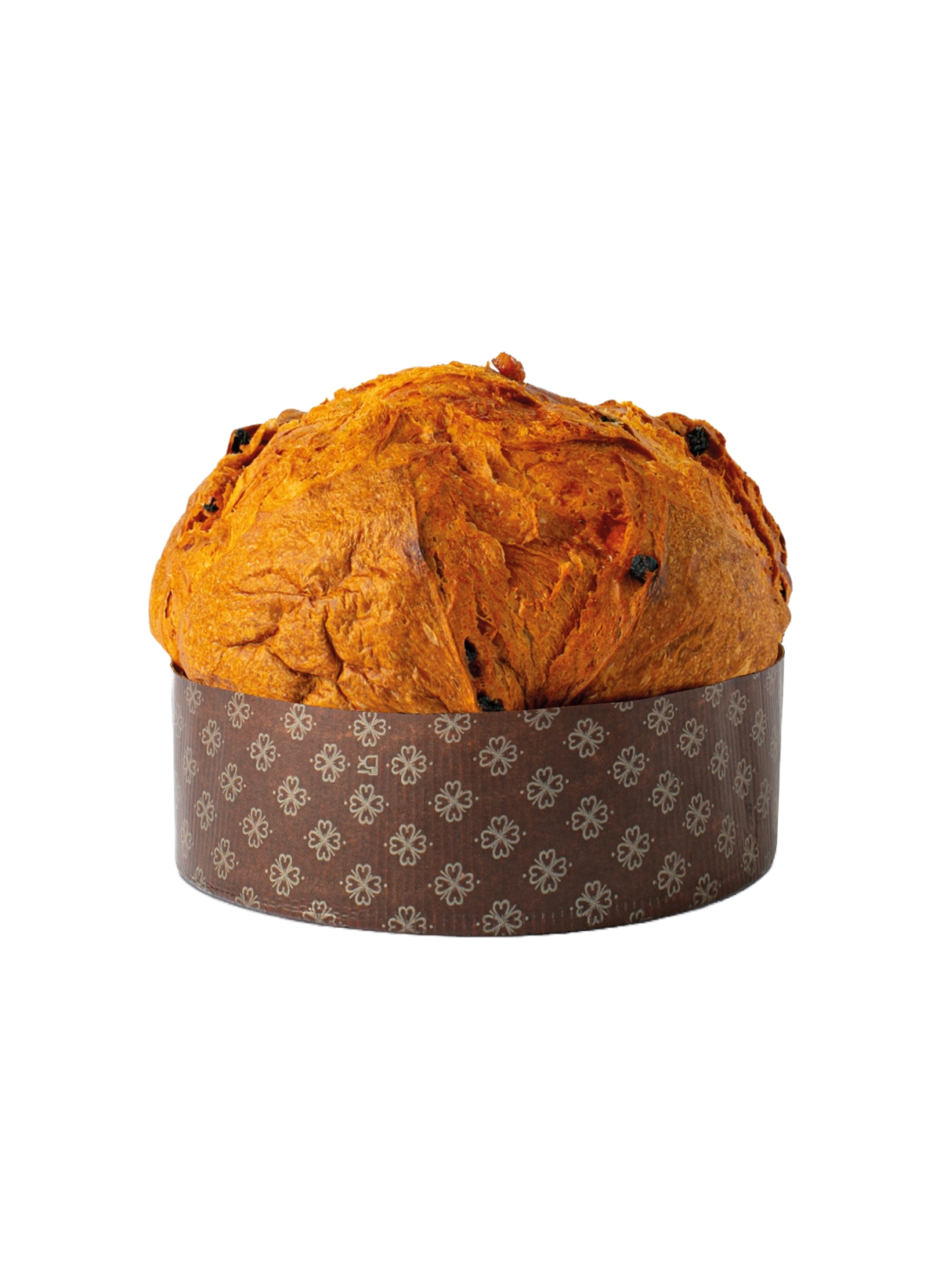 Ingredienti: farina di frumento, burro delattosato, uvetta (20%), zucchero, tuorli d’uova fresche di categoria A da galline allevate a terra, scorze d’arancia candita (15%) (scorza d’arancia, sciroppo di glucosio, zucchero), lievito madre naturale (frumento), pasta d’arancia, miele, malto, sale, bacche di vaniglia naturale del Madagascar.