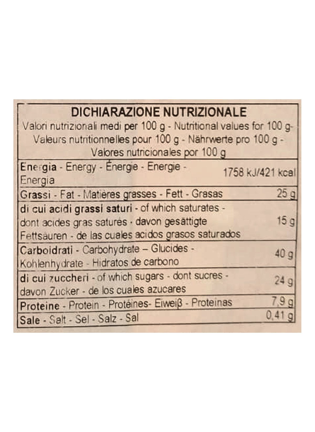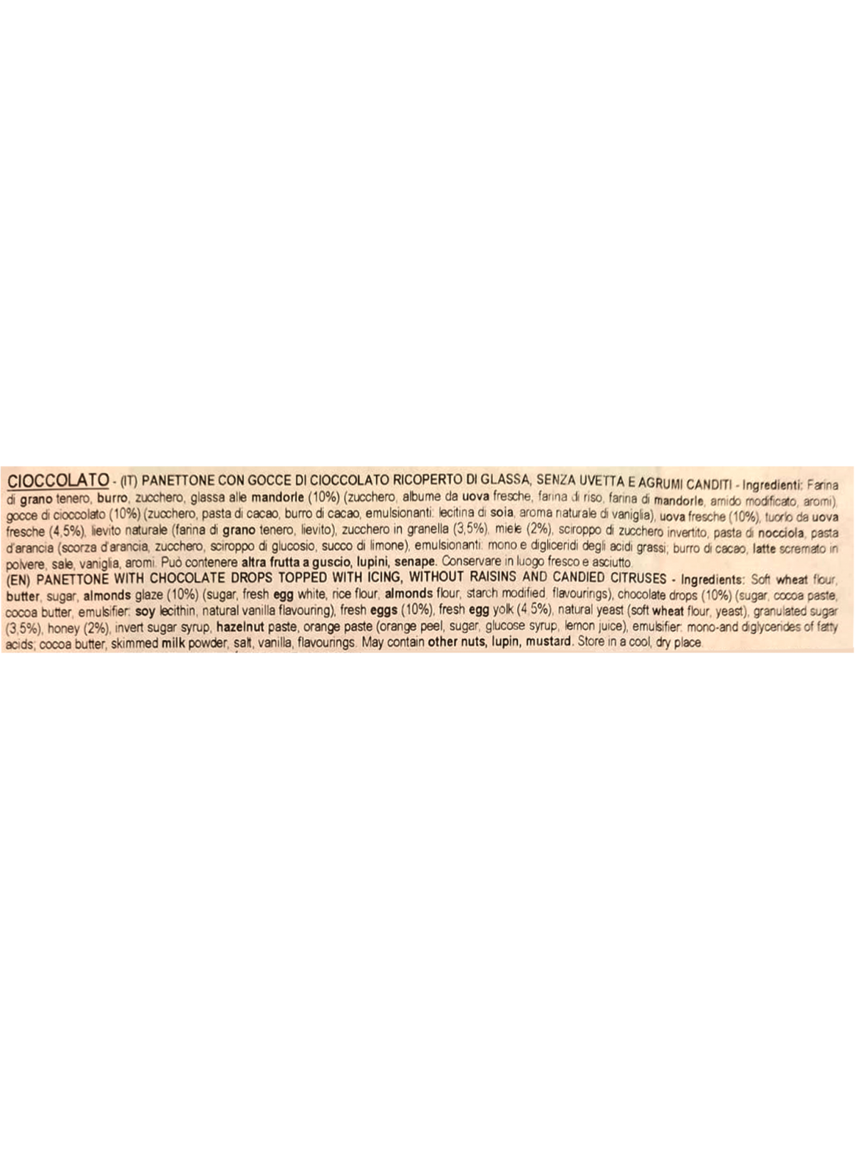 Ingredienti: Farina di grano tenero, burro, zucchero, uova fresche, gocce di cioccolato (10%) (zucchero, pasta di cacao, burro di cacao, emulsionante: lecitina di soia, estratto di vaniglia), tuorlo da uova fresche, lievito naturale (contiene farina di grano), pasta di nocciola (2%), miele di Sicilia, zucchero invertito, purea d’arancia (scorza d’arancia macinata, zucchero, succo di limone concentrato), emulsionante: mono e digliceridi degli acidi grassi, burro di cacao, latte scremato in polvere, sale, aromi naturali: bacche di vaniglia. Glassa (11%) (albume da uova fresche, zucchero, farina di riso, farina di armelline, amido modificato, aromi, cacao amaro), zucchero in granella. Può contenere tracce di altra frutta secca a guscio.