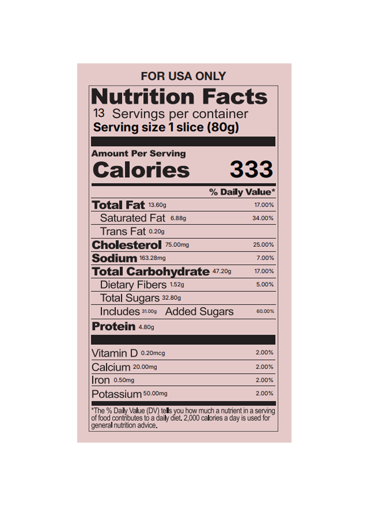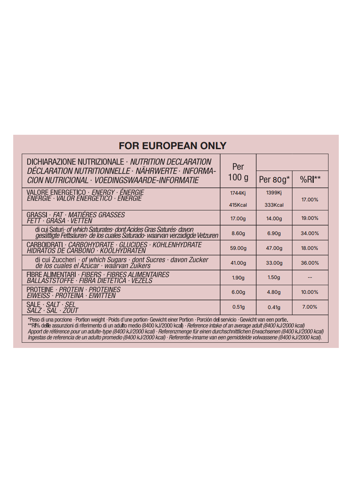 Emulsionante: mono e digliceridi degli acidi grassi di origine vegetale, Sciroppo di zucchero invertito, Lievito naturale da pasta acida (GRANO), Proteine del LATTE, Burro di cacao, Sale, Aromi naturali.