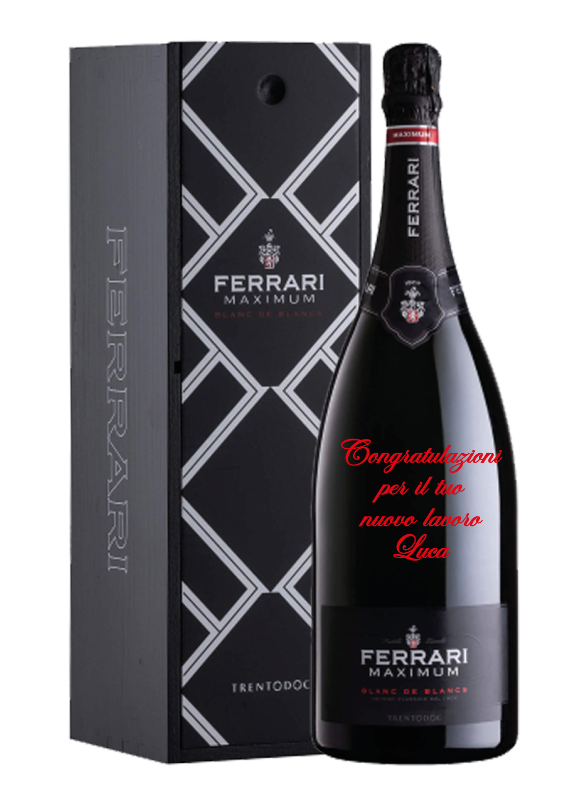 Il Ferrari Brut è un grande classico della rinomata cantina, oggi rivisitato per i clienti più originali in versione Magnum, da 150 cl, e custodito in un elegante astuccio di legno. La bottiglia Ferrari per le tue grandi occasioni ora è personalizzabile: scrivi il testo nella sezione “personalizzazione del prodotto” e salvalo, poi aggiungi l’articolo al carrello.