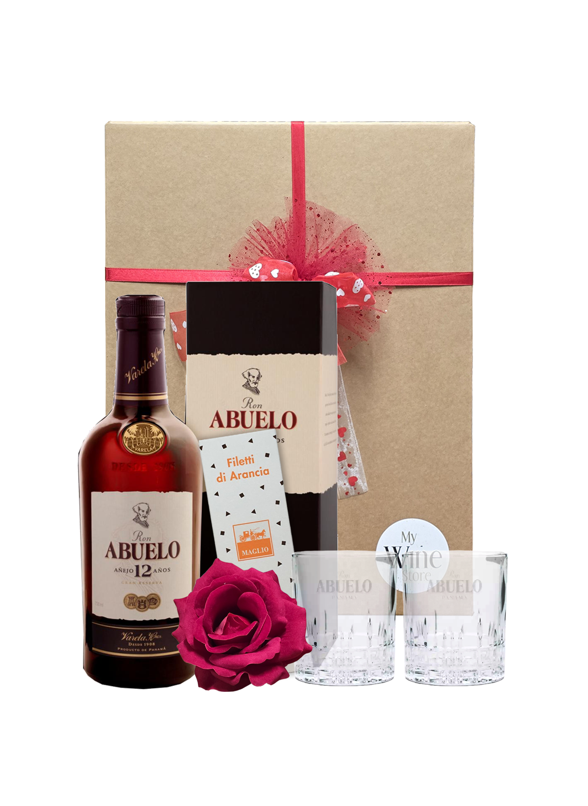Sorprendi la persona che ami con un regalo unico, da condividere. Questa contiene l'eccezionale e pluripremiato rum Abuelo 12 yo insieme a due bicchieri per la degustazione e ai Filetti di Arance candite ricoperte di cioccolato Maglio, considerati i migliori secondo la prestigiosa "Compagnia del cioccolato".