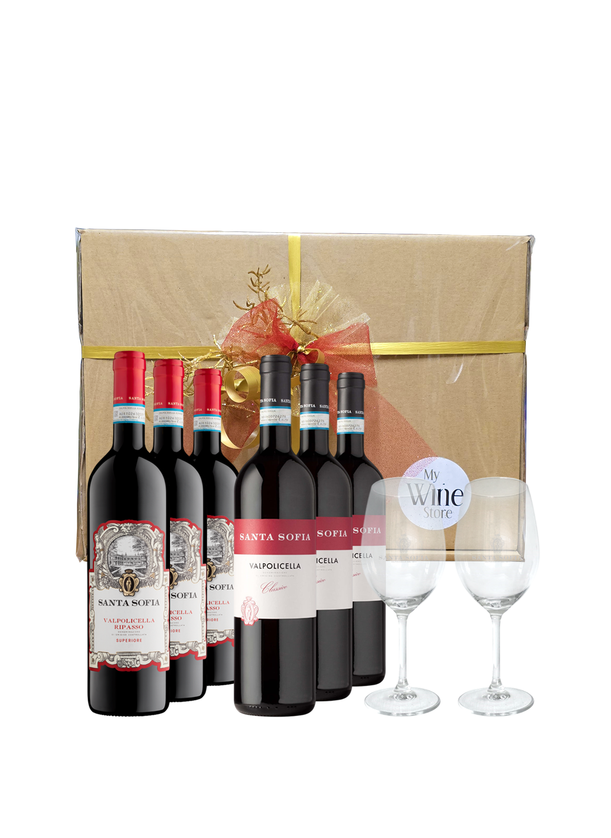 Scatola degustazione contenente 3 Valpolicella Ripasso, 3 Valpolicella e 2 Calici Santa Sofia