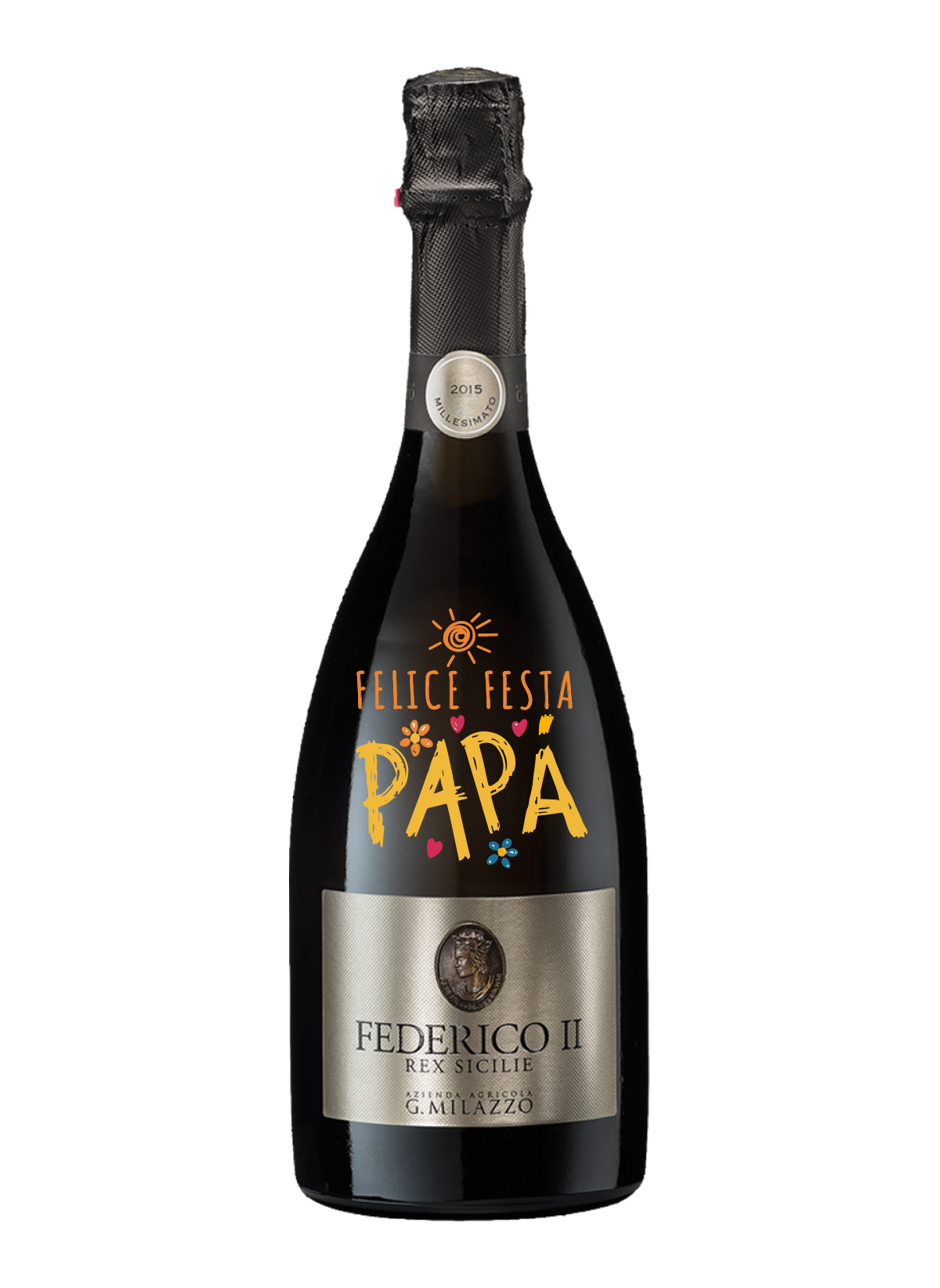 Quella che vedi in foto è un esempio di co e sarà la tua bottiglia personalizzata. P er avere una bottiglia personalizzata devi scegliere un vino, spumante o champagne in catalogo a cui andremo ad applicare questa decorazione, impressa sul vetro.