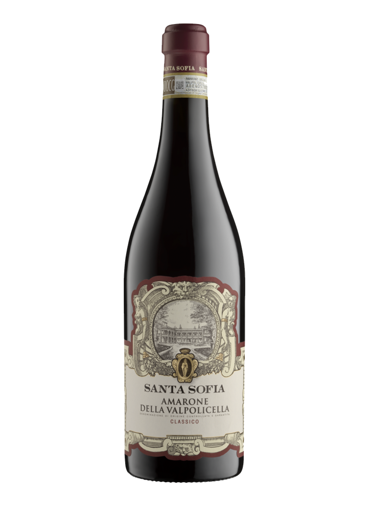 L’Amarone della Valpolicella Classico Santa Sofia è un vino elegante e potente, ottenuto da uve Corvina, Corvinone e Rondinella appassite con cura. Profondo nei profumi di amarena, spezie e cioccolato, avvolge il palato con morbidezza e calore, offrendo un finale lungo e vellutato. Ideale con carni rosse, selvaggina o formaggi stagionati, è un rosso iconico che unisce tradizione, intensità e fascino senza tempo.